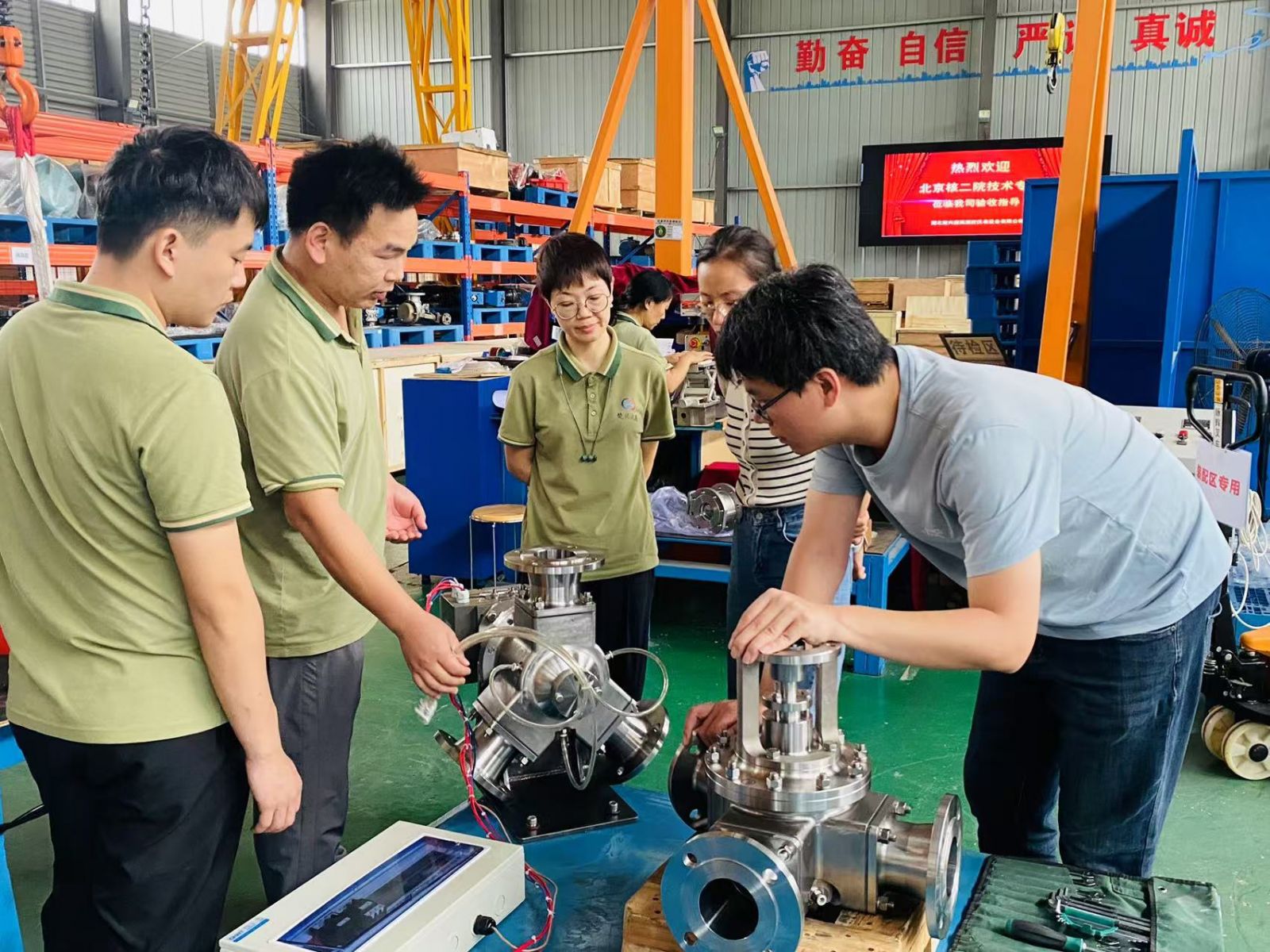 2024年10月17日,北京核二院(全稱“中國核電工程有限公司北京核化工研究設(shè)計(jì)院”)技術(shù)專家蒞臨我司驗(yàn)收指導(dǎo)研發(fā)定制的三通粉體切換閥項(xiàng)目。楚興捷高從設(shè)計(jì)、備料、生產(chǎn)、加工、裝配調(diào)試、檢測直至出廠檢驗(yàn)合格一把抓。